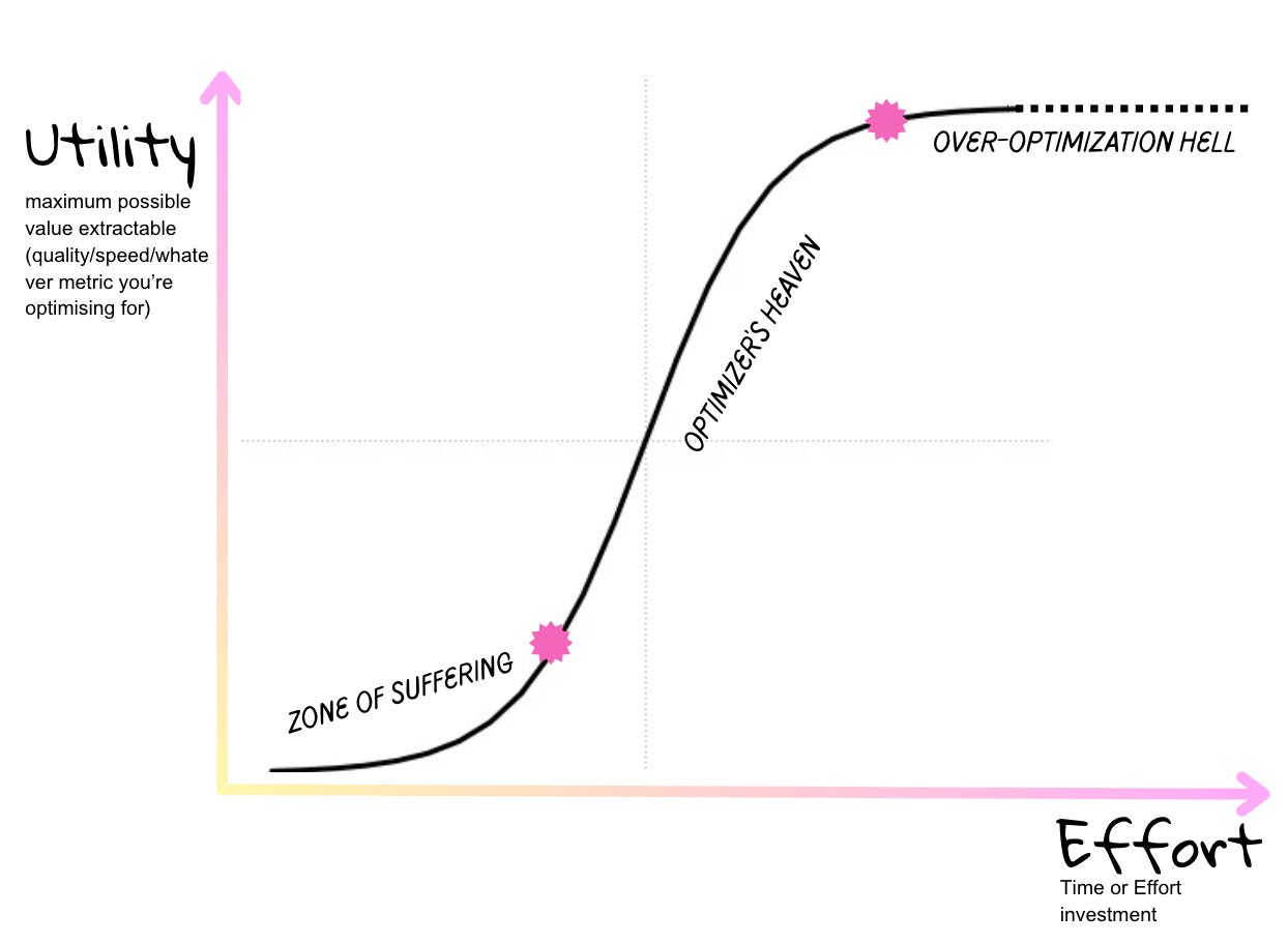 Self-explanatory but to state explicitly: Effort does not follow a linear relationship with Utility. Utility being an all encompassing term for Value or the Key Metric or whatever it is you are trying to Optimize. Utility is the subjective quality that makes you say “that’s what good looks like”